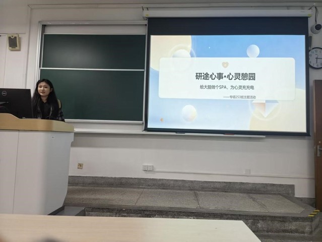 专硕253班于研究生楼开展了以“给大脑做个SPA,为心灵充充电”为主题的“研途心事・心灵憩园”心理健康活动。本次活动由班长孔钰主持,全班同学积极参与。